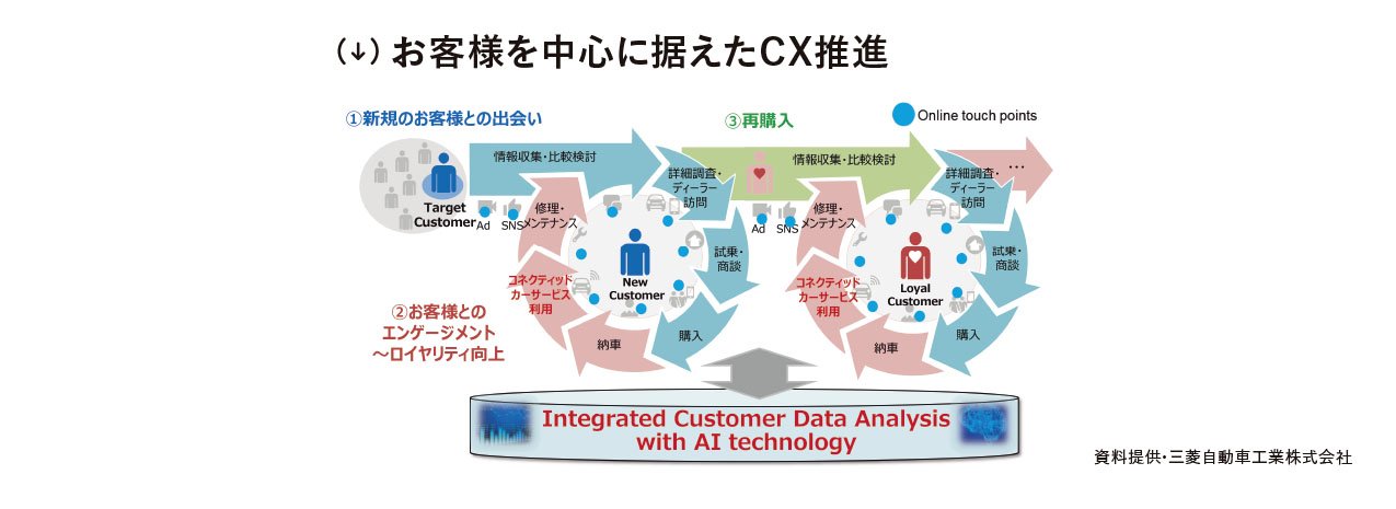もちろん購入された後のアフターサービスでも同様にデータを連携。図の青い丸がそれぞれデータを取得するデジタルタッチポイントになっていて、ここでのお客様との機会を増やすことによって、お客様の接点情報が新たに出てきます。