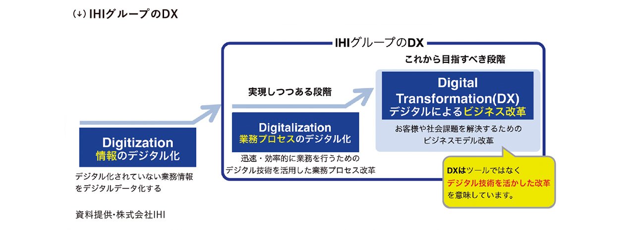 IHIはまだ誰もが作っていないものを創造し、開発する会社です。そのために試行錯誤を繰り返し、日々、様々なチャレンジをしています。DXにおいても同様に、現場の進化に合わせてステップを変え、ビジネス変革を進めていくことが目標になるかと思います。