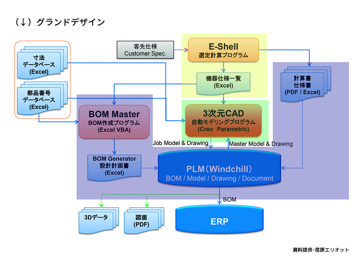 そしてもう1つがBOM(Bill Of Materials)の自動生成で、これにも取り組みました。基本設計プログラムから吐き出される基本設計仕様を基にBOMを作成してPLM(Product Lifecycle Management)で管理し、最終的にはERPに投入し生産活動を行う。この一連の流れが設計におけるDXの1つの姿だと思います。