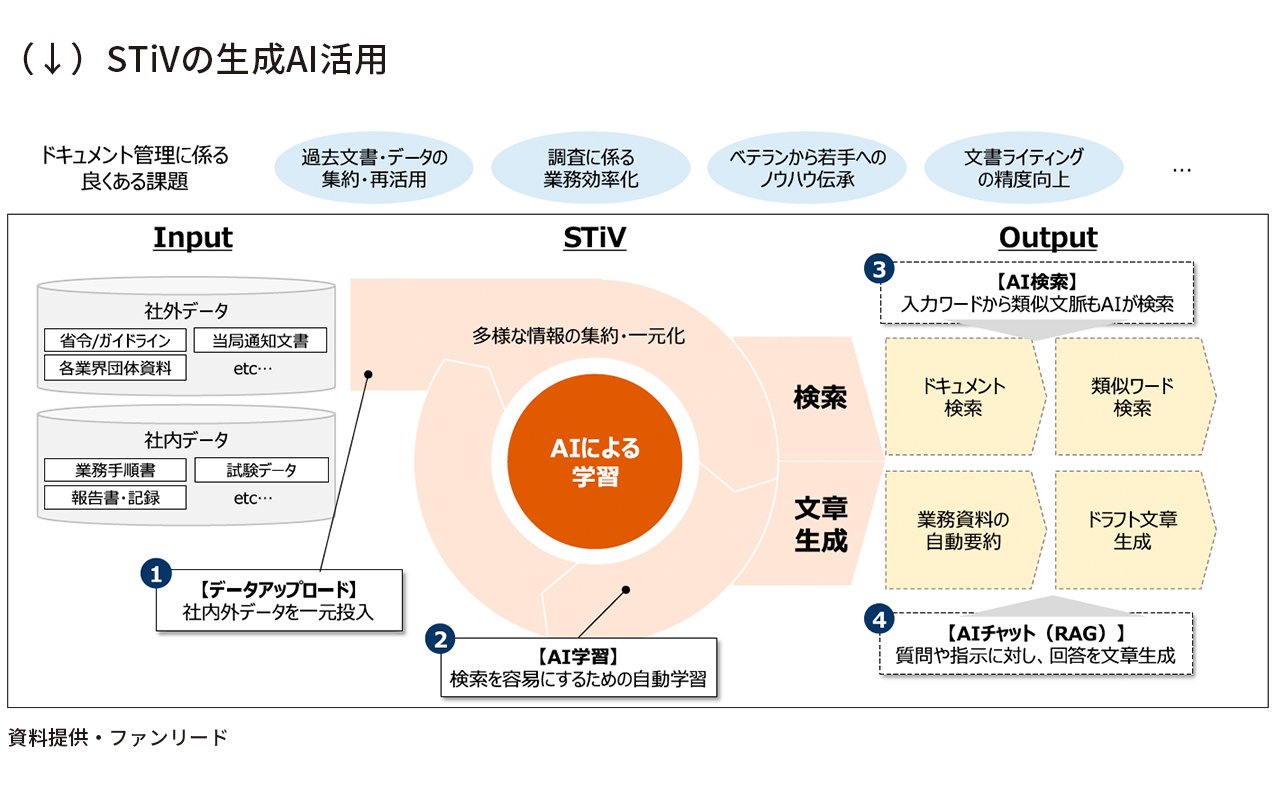 これらの情報資産活用を円滑にするために開発したプロダクトが、生成AIを搭載した独自のAIナレッジメントシステム「STiV(スティーブ)」です。STiVは、ドキュメントのファイル名だけでなく、文書中の一言一句を高速に検索できることが特徴です。また、手書きの文章も全てAI-OCRをかけてデジタルデータ化するため、メモのようなものまで検索の対象になります。頻繁に改訂される法令なども生成AIとのチャットにおいて“最新の情報で”“変更内容を具体的に”などのプロンプト(指示)を与えれば、必要な情報のみ記載された要約文を引き出すことも可能です。