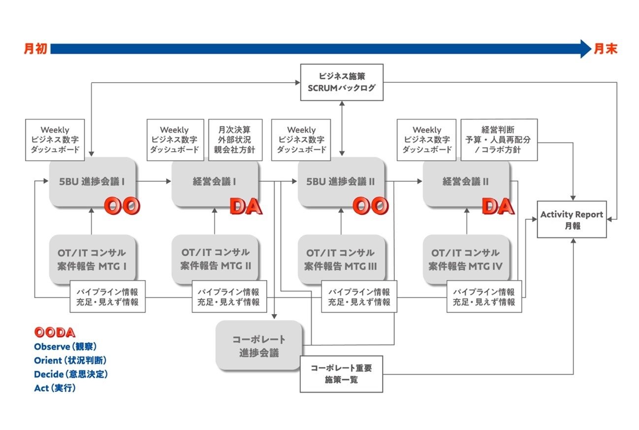 横河デジタルでは、FY24の経営会議体にアジャイル的手法を取り入れました。経営ミーティングやそのアクション・アウトプット(月報等)をスクラムで回すことにしたのです。